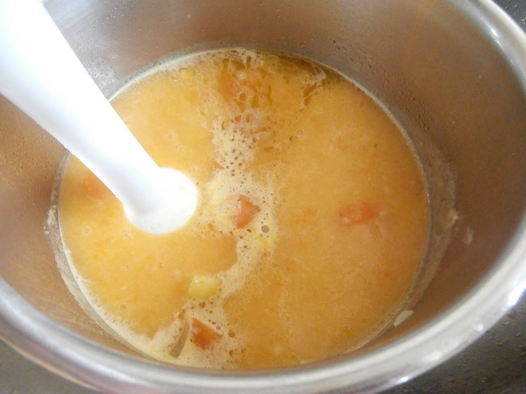 - Mit dem Pürierstab zu einer schön orangefarbenen Suppe pürieren.