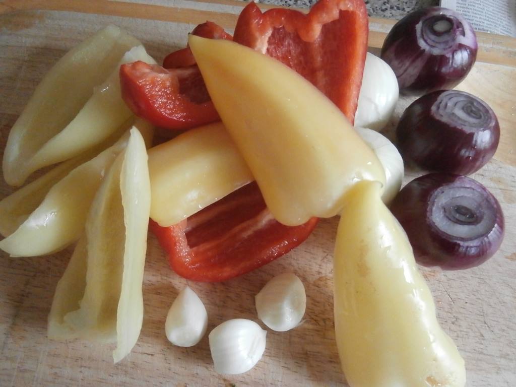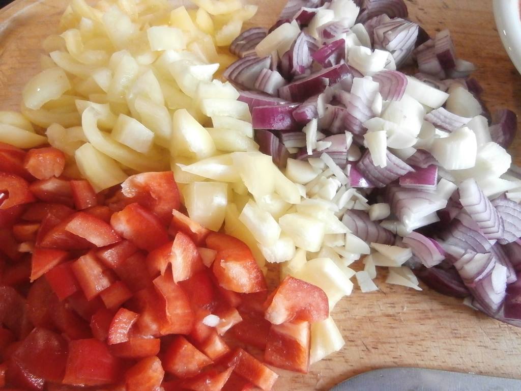 - Paprikaschoten aufschneiden, Kerne und Stiele entfernen, waschen und in kleine Stücke zerschneiden.
