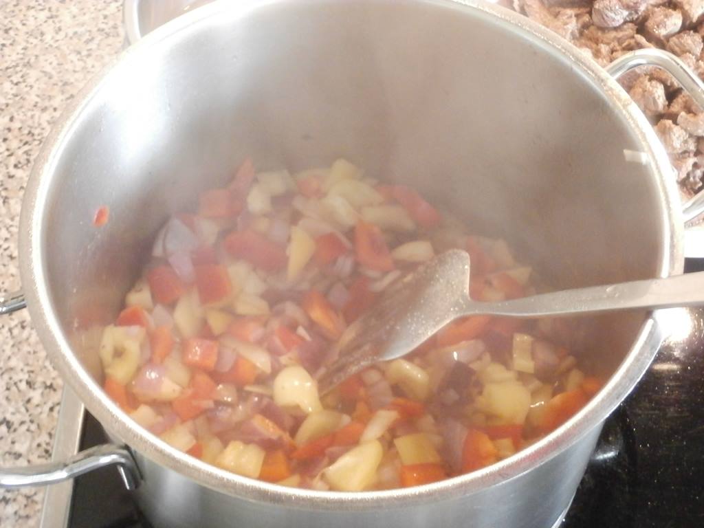 - Fett in einem großen Topf erhitzen, Zwiebel und Knoblauch darin glasig dünsten.
