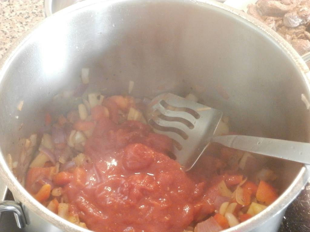 - Nach 2 bis 3 Minuten die Fleischbrühe hineingießen und alles in ca. 30 Minuten auf kleiner Flamme weich kochen.