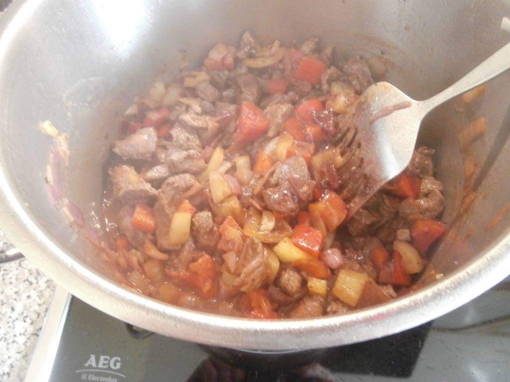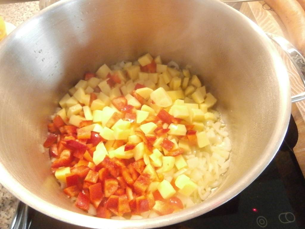 - Kartoffeln und Paprika dazu und bei starker Hitze anbraten.