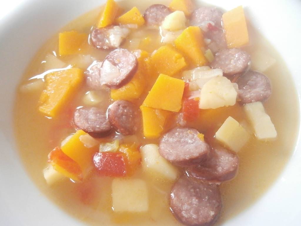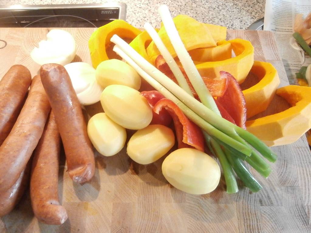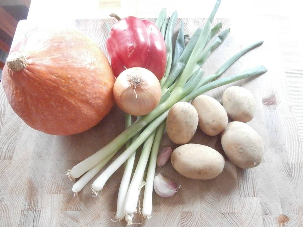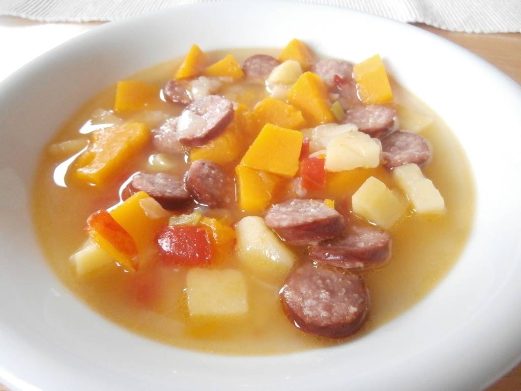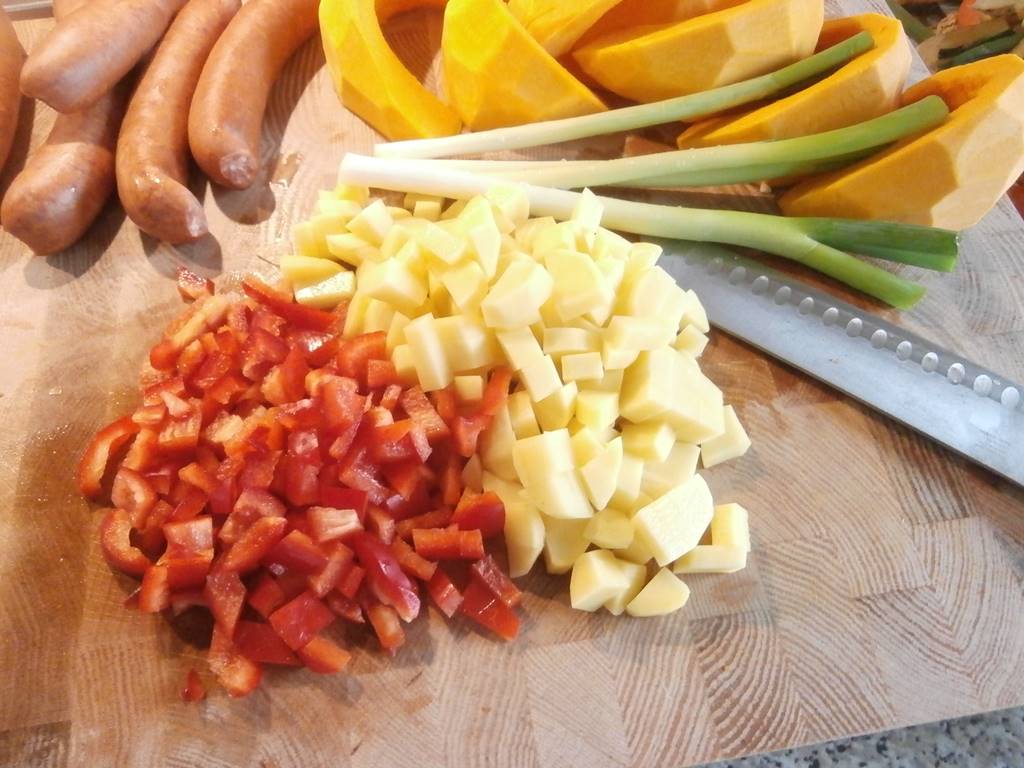 Der Kürbis ist ein oft unterschätztes vielseitiges Gemüse, schmackhaft und gesund. Gerade in Herbst und Winter, wo der Kürbis geradezu in Massen auf den Markt kommt, helfen dir und deinem Körper die vielen Vitamine, Mineralien und Ballaststoffe über die kälter werdenden Temperaturen. Ich bevorzuge den Hokkaido-Kürbis, der eher zu den kleineren Vertretern seiner Gattung gehört. Er hat eine schöne orangerote Farbe und kann auch ungeschält verarbeitet werden. Ich selbst schäle ihn aber immer, das macht nicht viel Arbeit und die Gerichte werden samtiger. Für meinen kräftigen Eintopf kombiniere ich ihn mit Zwiebeln, Kartoffeln und Paprika.