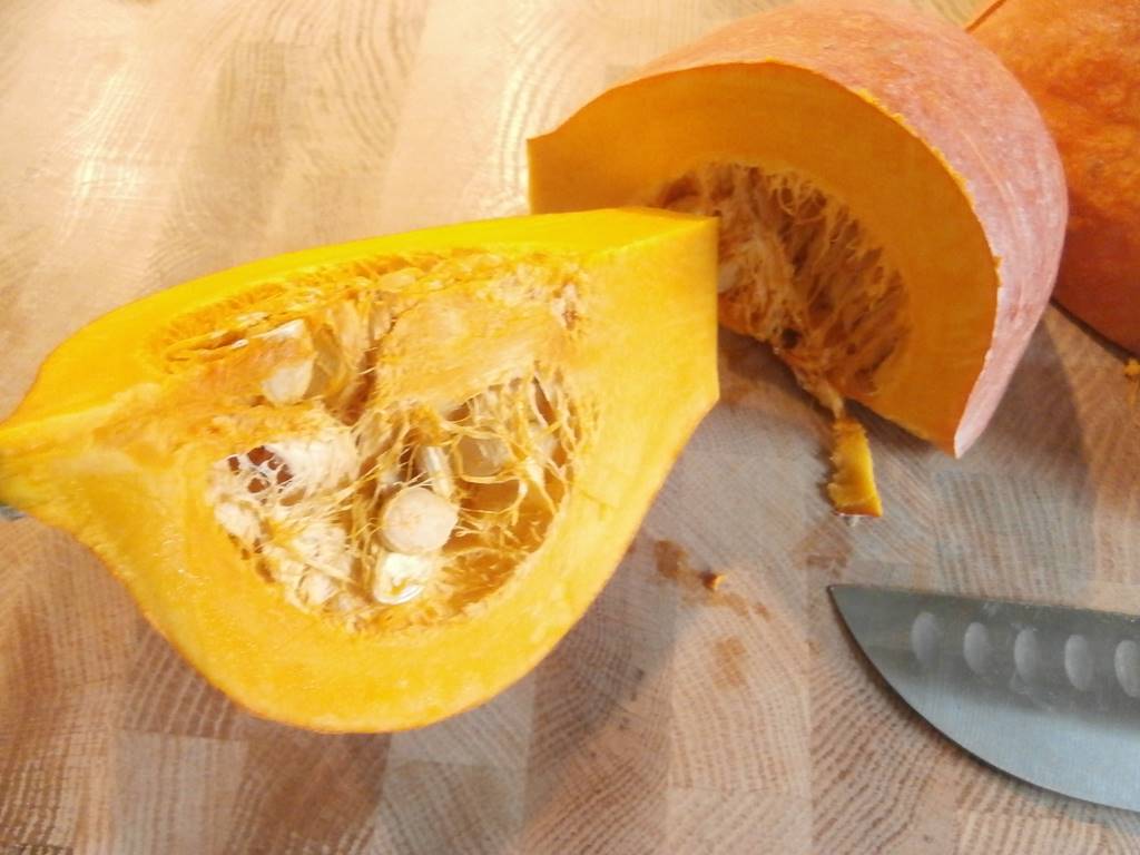 - Den Kürbis vierteln, die Kerne mit einem Löffel sorgfältig herauskratzen.