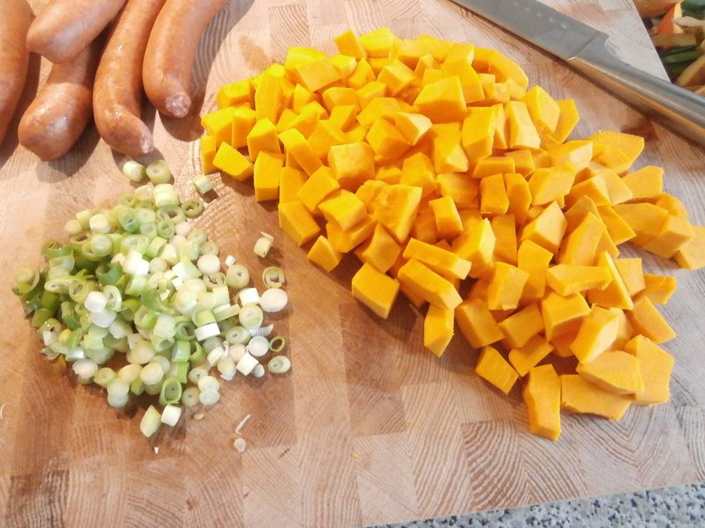 - Die Kürbisviertel schälen und in kleine Würfel schneiden.