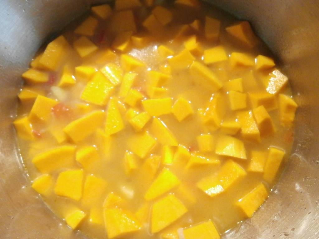 - Kürbiswürfel hineingeben, durchheben, restliche Fleischbrühe dazu und 5 Minuten weiter köcheln.