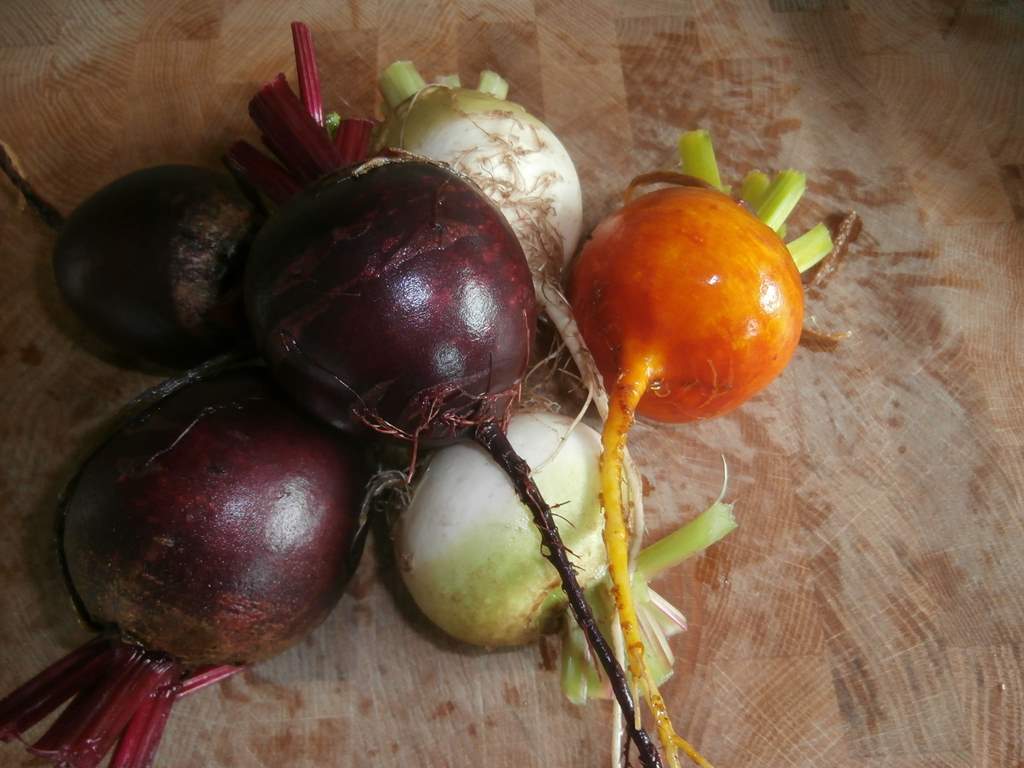 Die meisten von uns kennen die Rote Beete, ein überaus gesundes Gemüse, das leider meistens eingelegt aus dem Glas kommt. Die Rote Beete hat aber einige Schwestern, die ganz nach Aussehen Gelbe Beete, Weiße Beete oder Geringelte Beete heißen. Man kennt die Beete auch unter dem Sammelnamen Rüben. Alle Vertreter dieser Gemüsefamilie schmecken einfach köstlich und die Zubereitungsarten sind sehr vielfältig. Allerdings solltest du bei der Arbeit mit frischen Knollen Einmalhandschuhe anziehen, den besonders die Rote Beet färbt alles, was mit ihr in Berührung kommt. Und hier kommt mein Eintopf aus den verschiedenen Beete-Sorten mit Hühnchenfleisch. Ab besten hast du einen Tag vorher eine →Hühnerbrühe aus frischem Suppenhuhn gekocht.