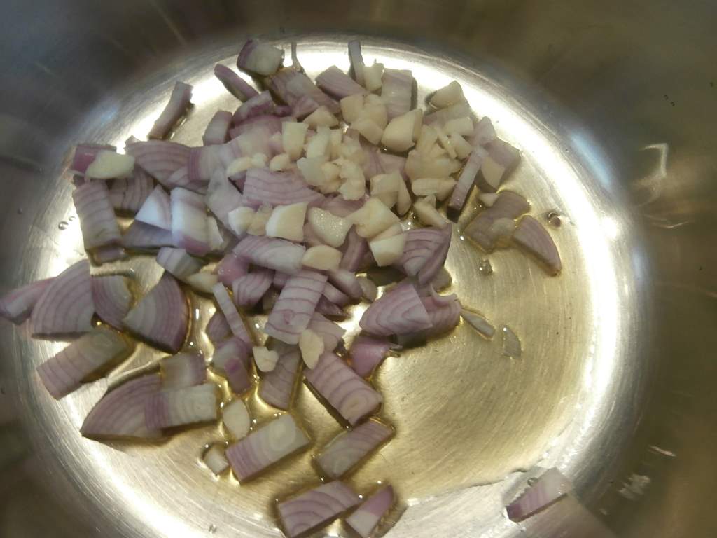 - In einem passend großen Topf (alle Zutaten müssen hinein) Knoblauch und Schalotte in Olivenöl glasig anschwitzen.