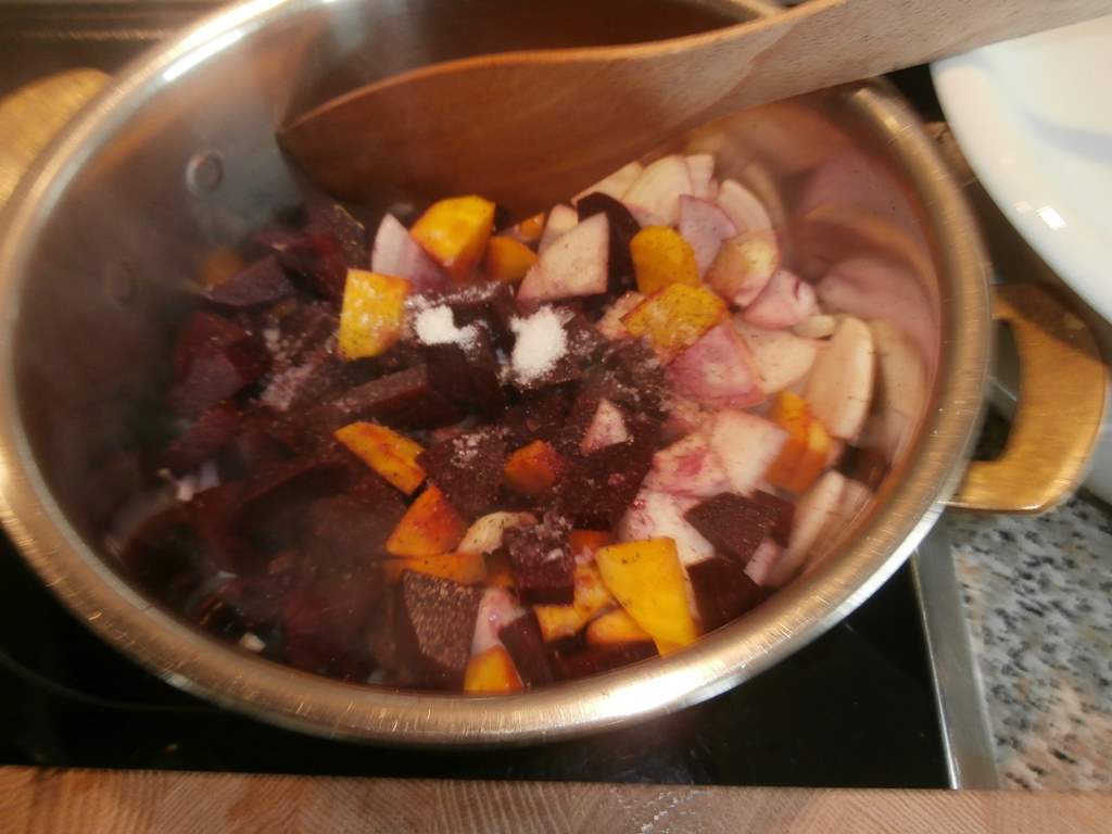 - Die Beetestücke dazugeben, mit Salz (Fleur de Sel wäre prima), Pfeffer aus der Mühle, ein wenig weißem Balsamico und einer guten Prise Zucker würzen.