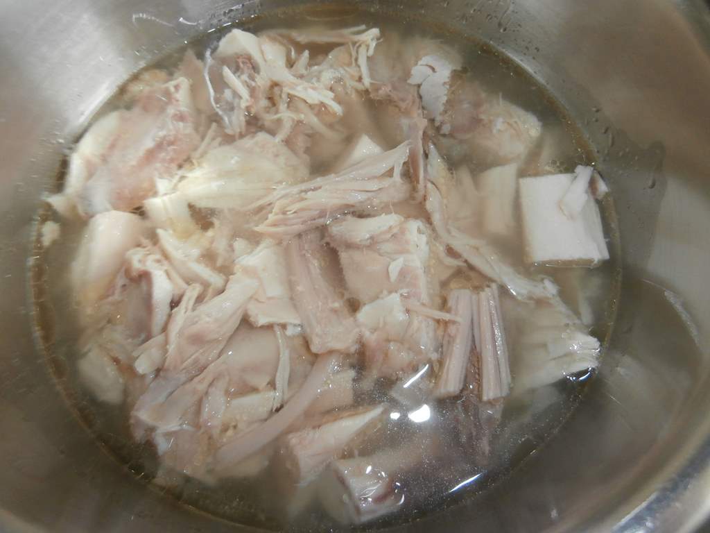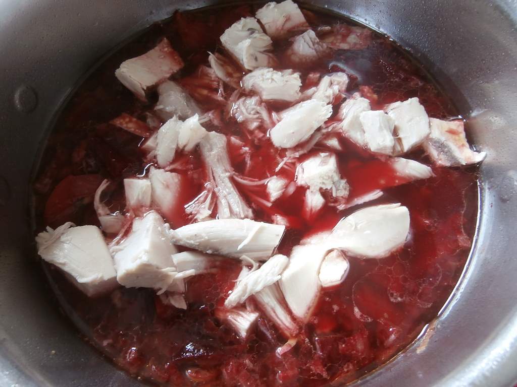 - Zwischendurch hast du reichlich Stücke vom Hühnerfleisch in etwas Brühe aufgewärmt. Das gibst du jetzt alles in den Topf.