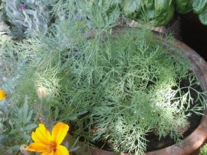 ist ein fast unentbehrliches Gewürz für Gurkensalate und Fischgerichte. Ich säe Dill ab Mitte März in kleine Töpfe und ab Ende April kommen die kleinen Pflänzchen in einen großen Topf. Auch Dill wird ab und zu nachgesät.