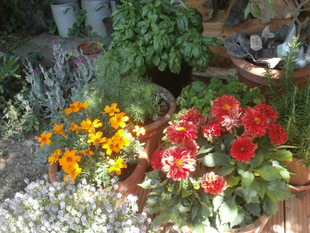 Töpfe mit verschiedenen Kräutern sehen in Kombination mit Blumen auf Balkon und Terrasse auch noch sehr schön aus.