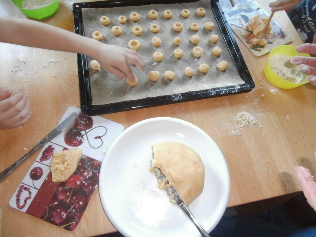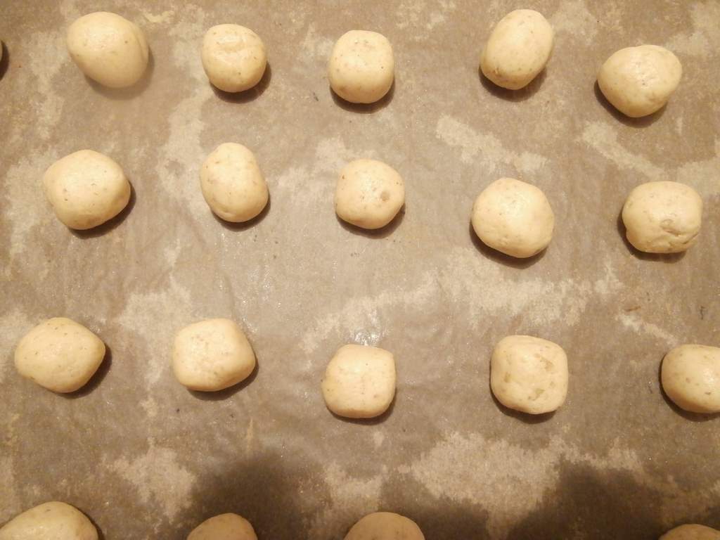 - Mit leicht bemehlten Händen kleine Kugeln formen und auf das Backblech setzen.