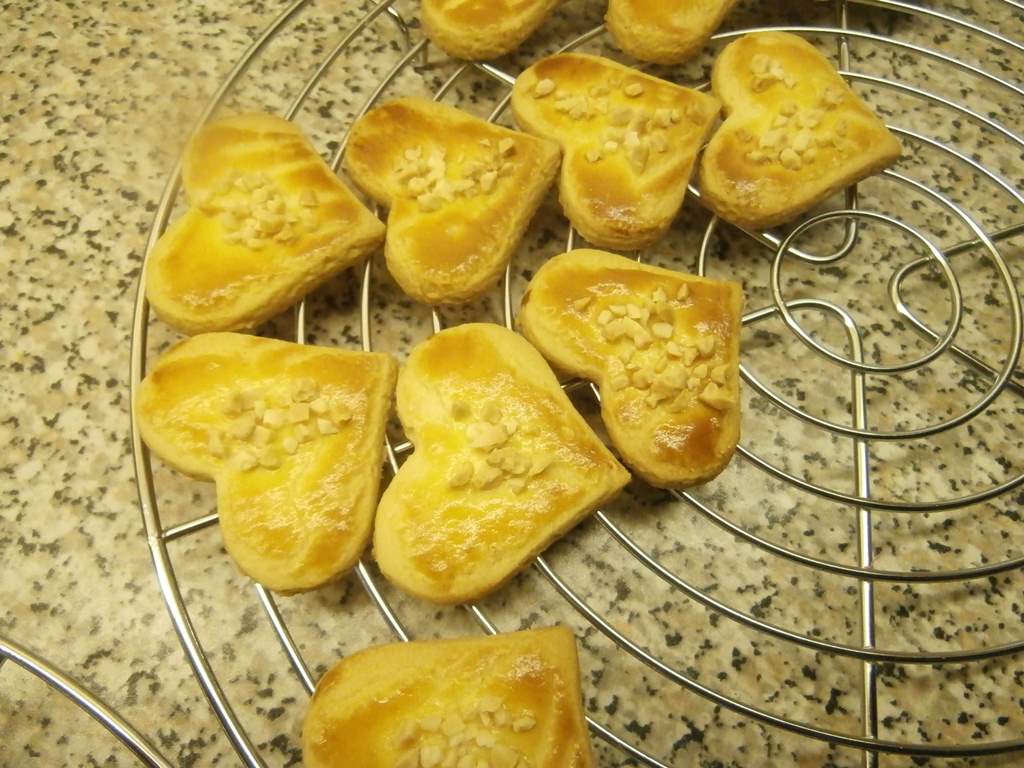 - Das zweite Eigelb mit der Sahne verquirlen, die Platzchen damit bestreichen und mit gehackten Mandeln verzieren.