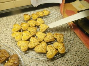 - Den Teig auf einer leicht bemehlten Arbeitsfläche ca. ½ cm dick ausrollen, Herzen ausstechen und auf das Backblech legen.