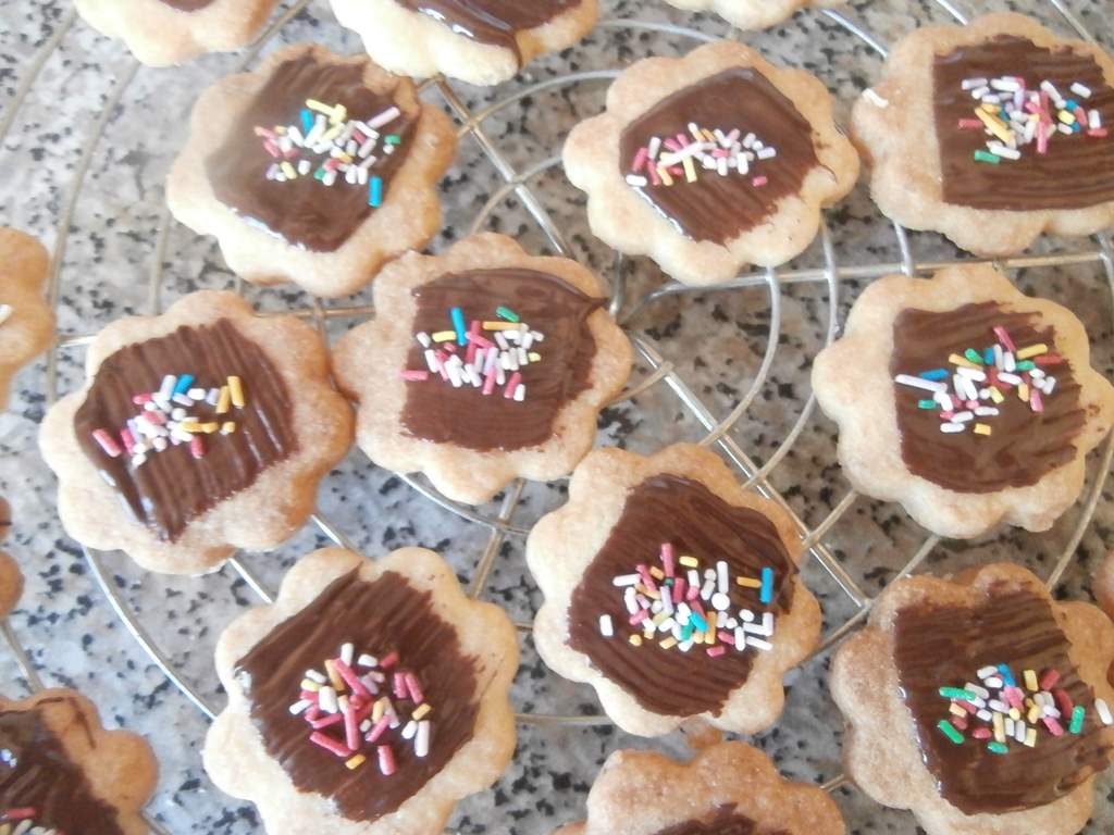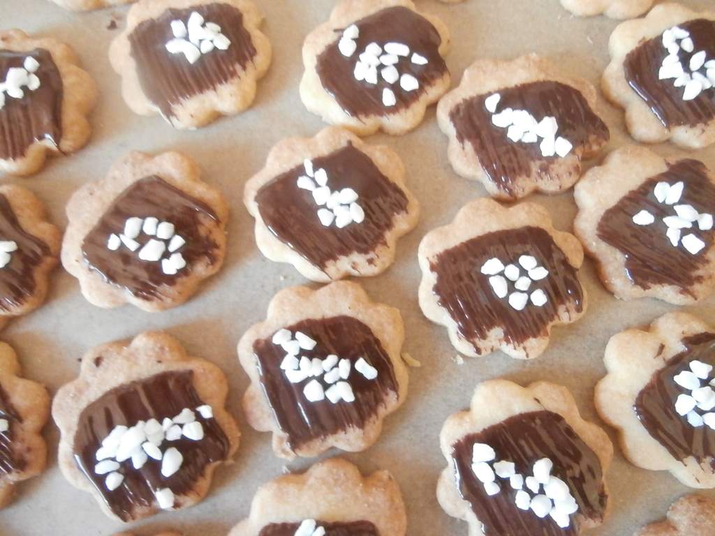 - Nach dem Auskühlen die Plätzchen mit geschmolzener Kuvertüre halb bestreichen.