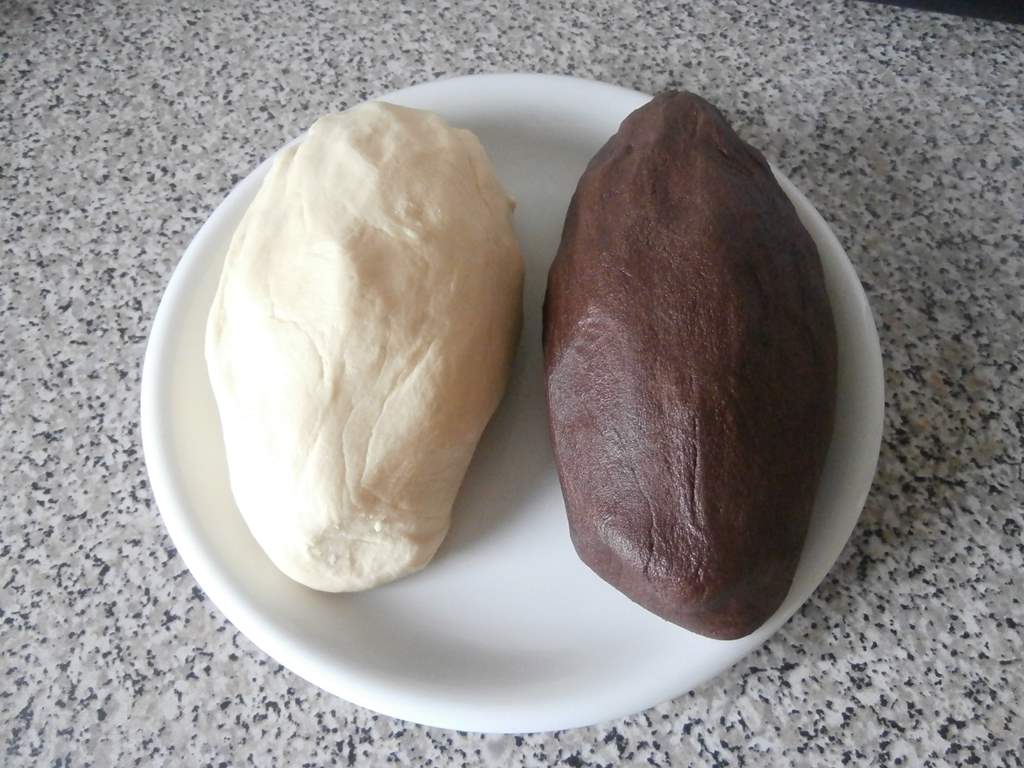 - Aus schwarzem und weißem Teig je eine dünne Teigplatte ausrollen.
