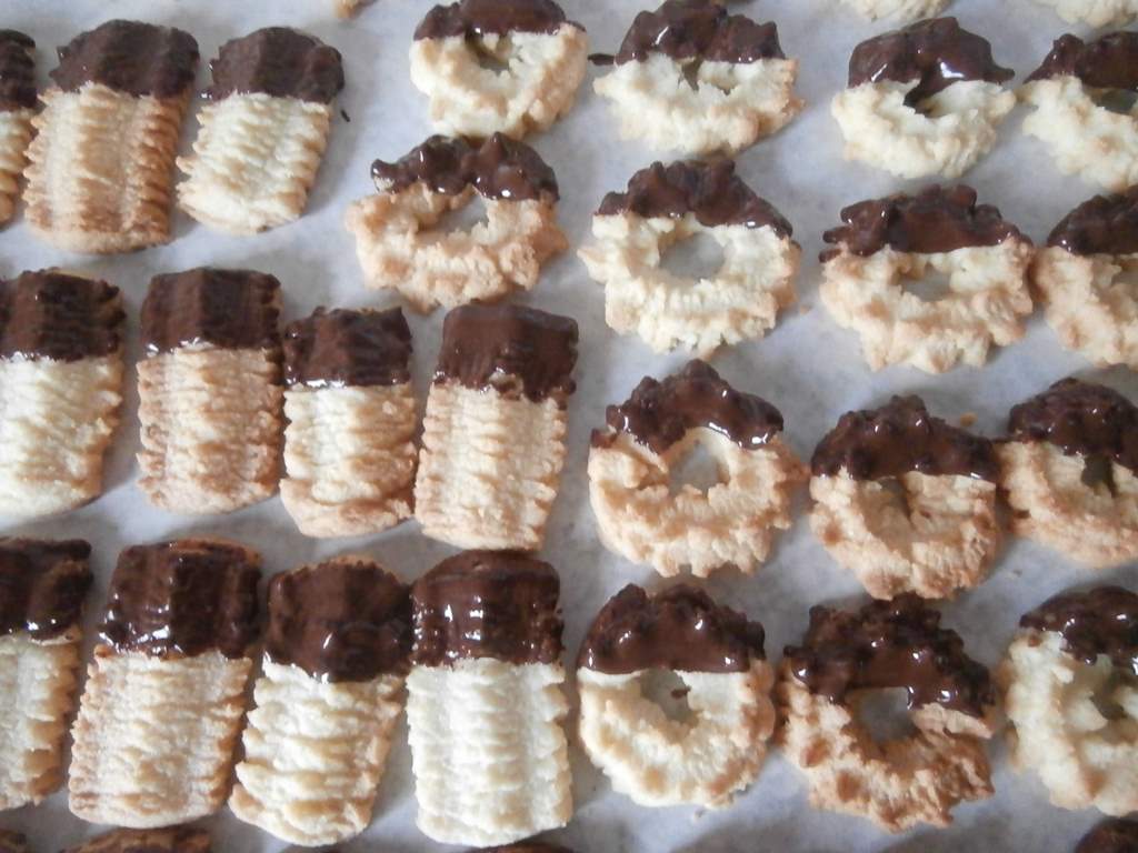 - Nach dem Auskühlen die Plätzchen mit geschmolzener Kuvertüre halb bestreichen.