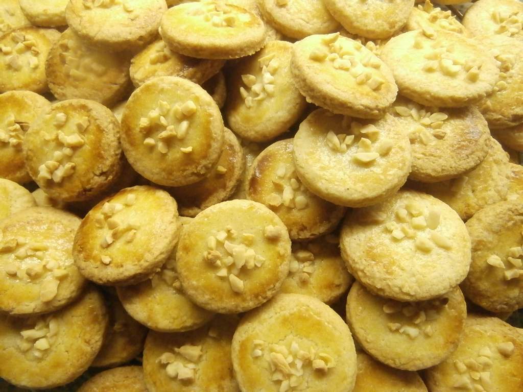 - Das zweite Eigelb mit der Sahne verquirlen, die Platzchen damit bestreichen und mit gehackten Mandeln verzieren.